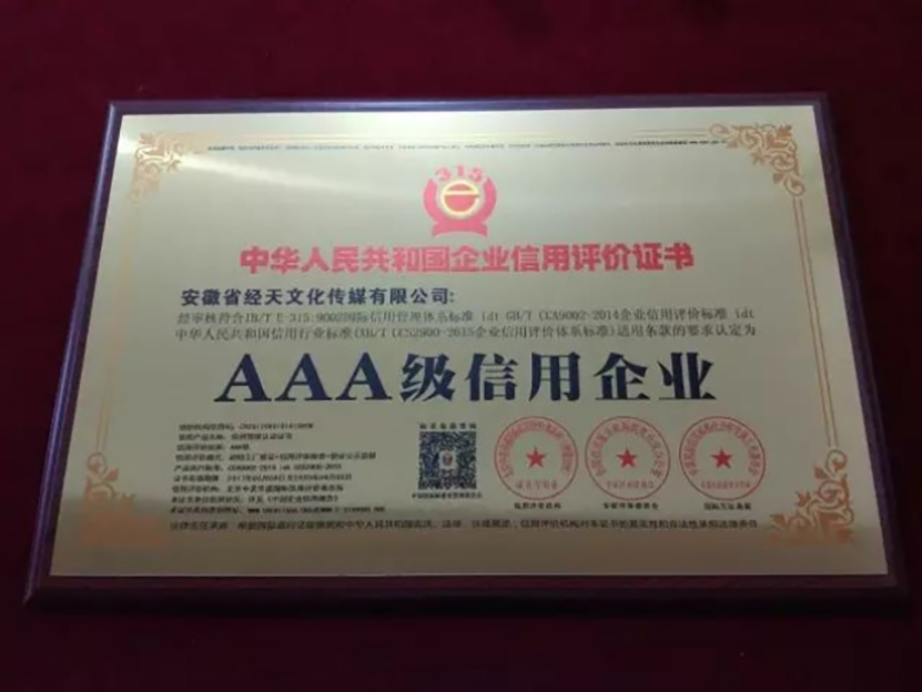 经天传媒自创立以来,一直注重信用建设,十多年服务过近百家客户,没出现一起信用事件,在广大业界拥有良好的口碑。在获得AAA信用认证以后,公司决心以此为新的起点,加强信用建设,使经天传媒在信誉、实力、服务等诸方面,成为行业内的一流品牌。