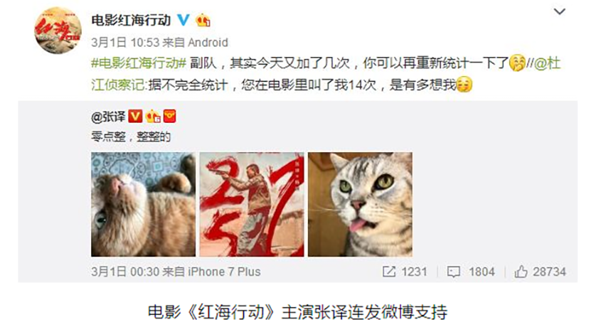 电影上映之前的微博营销,不外乎几种方式:刷热搜、上头条、制造话题、买大V营销号、让电影参演演员以及好友互发微博、热点的借势等。《唐人街探案2》《红海行动》也没有落俗。
